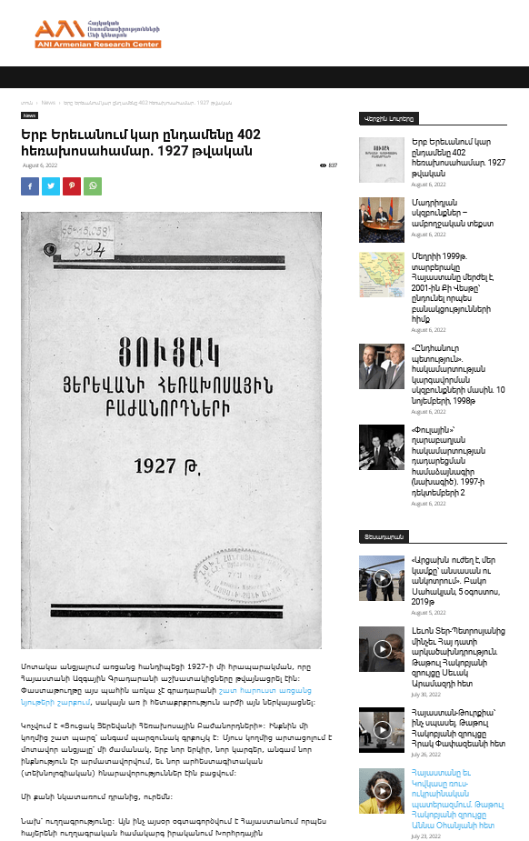Մոտակա անցյալում առցանց հանդիպեցի 1927-ի մի հրապարակման, որը Հայաստանի Ազգային Գրադարանի աշխատակիցները թվայնացրել էին: Փաստաթուղթը այս պահին առկա չէ գրադարանի շատ հարուստ առցանց նյութերի շարքում, սակայն առ ի հետաքրքրություն արժի այն ներկայացնել: